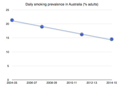The only problem is that it's total bollocks. The graph bears no relationship with reality. Smoking prevalence data in Australia is collected in the National Health Survey and published by the Australian Bureau of Statistics. The ABS happened to publish their latest smoking data this week and their graph looks very different: