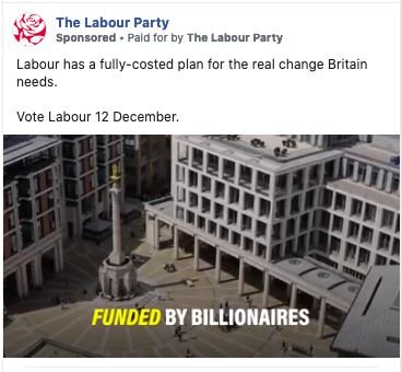 First Draft chose not to interpret them as misleading, however. Nor did it judge the ads below to be misleading (as we shall see in a moment, it didn't even look at them). These claimed that Labour would not raise taxes for 95% of the population. One of them claimed that Labour's extra spending would be paid for by billionaires. Full Fact disputed this, noting that a lot of people earning less than £80,000 a year would pay more tax under Labour as a result of changes to marriage allowance, inheritance tax, the sugar tax and corporation tax.